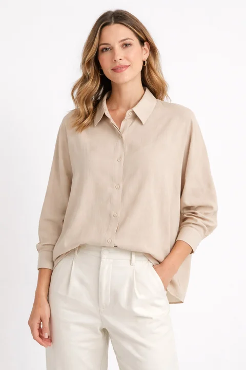 Camisa manga larga estilo murcielago, formato cuadrado. Tela de rayón con una hermosa textura de orientación vertical que le aporta personalidad a la prenda y estilizará la silueta. Largo a la cadera con estilo fluído. Botones de pasta al tono en cartera y puños.